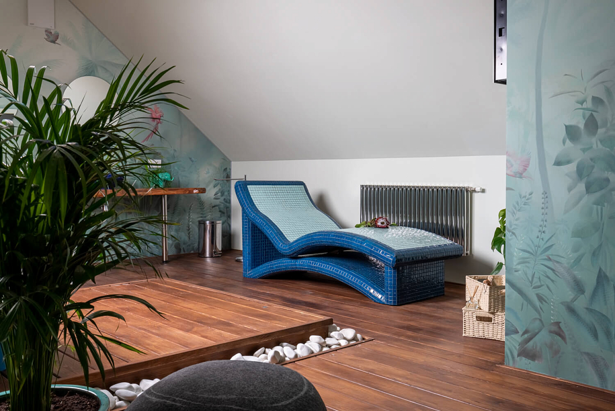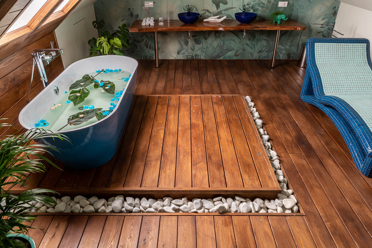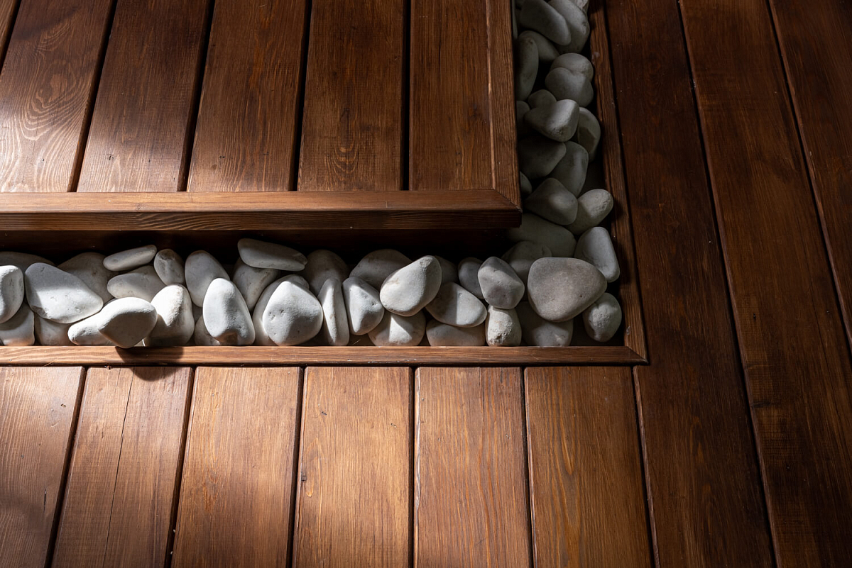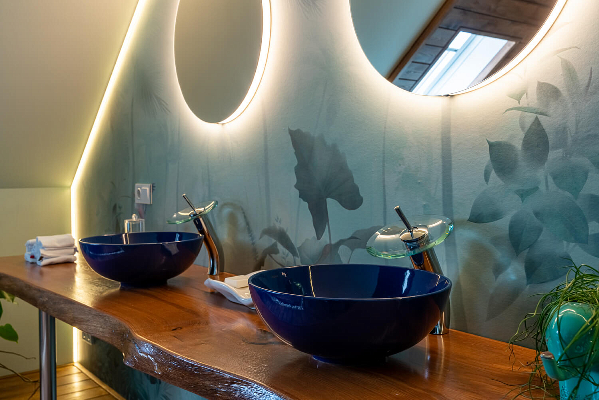 Хозяйка дома, Дарья, была готова к архитектурным экспериментам, поэтому дизайнер проекта Дарья Басанец предложила эскиз ванной комнаты в оригинальных бирюзовых тонах, с деревянной и каменной отделкой и подогревом пола. После всех необходимых согласований команда Душа впечатлений приступила к проекту.