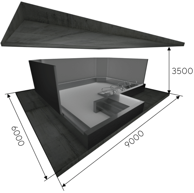 При входе в бассейн, вы окажетесь в озере, среди густого таёжного леса, где также услышите звуки природы, которые вскоре заглушит мощный шторм. Внезапно над вами сгущаются тучи и начинается ливень. Барабанящие звуки дождя и раскаты грома заполнят всё пространство бассейна, создавая атмосферу настоящего сибирского шторма.