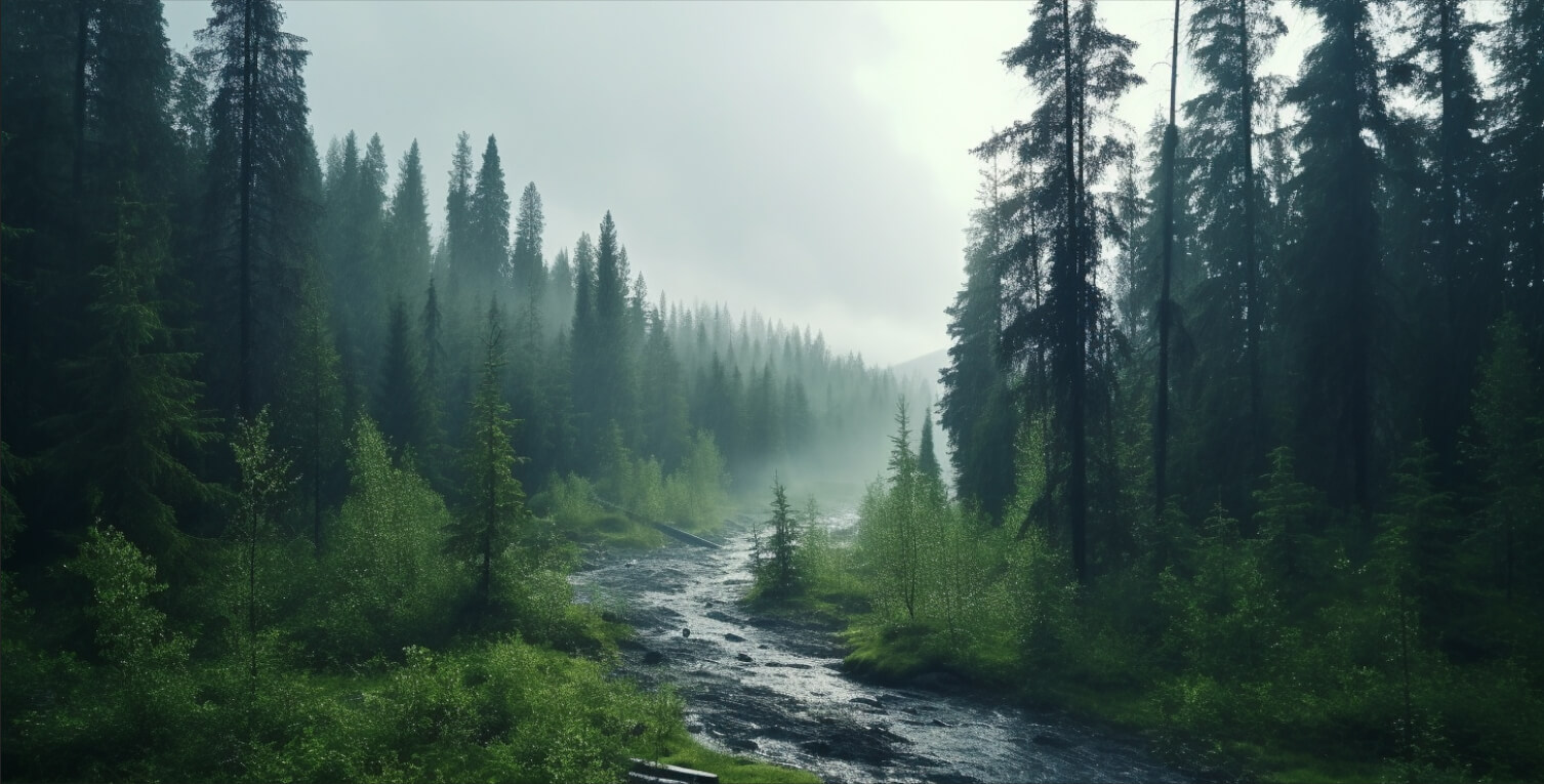 На экранах отображается таёжный лес. Начинаются далёкие раскаты грома и вспышки молний, озаряющие небо. Освещение постепенно темнеет и переходит в грозовой фронт. Всю программу вас будет сопровождать ощущение реального столкновения со стихией.