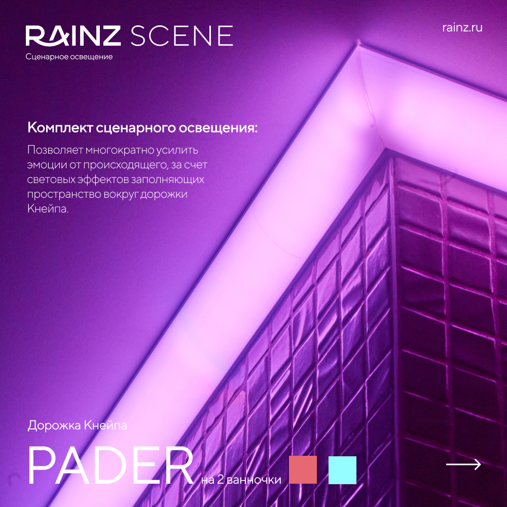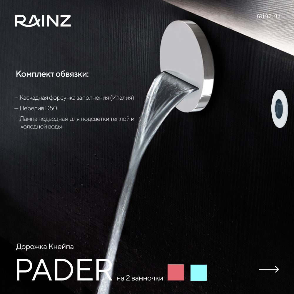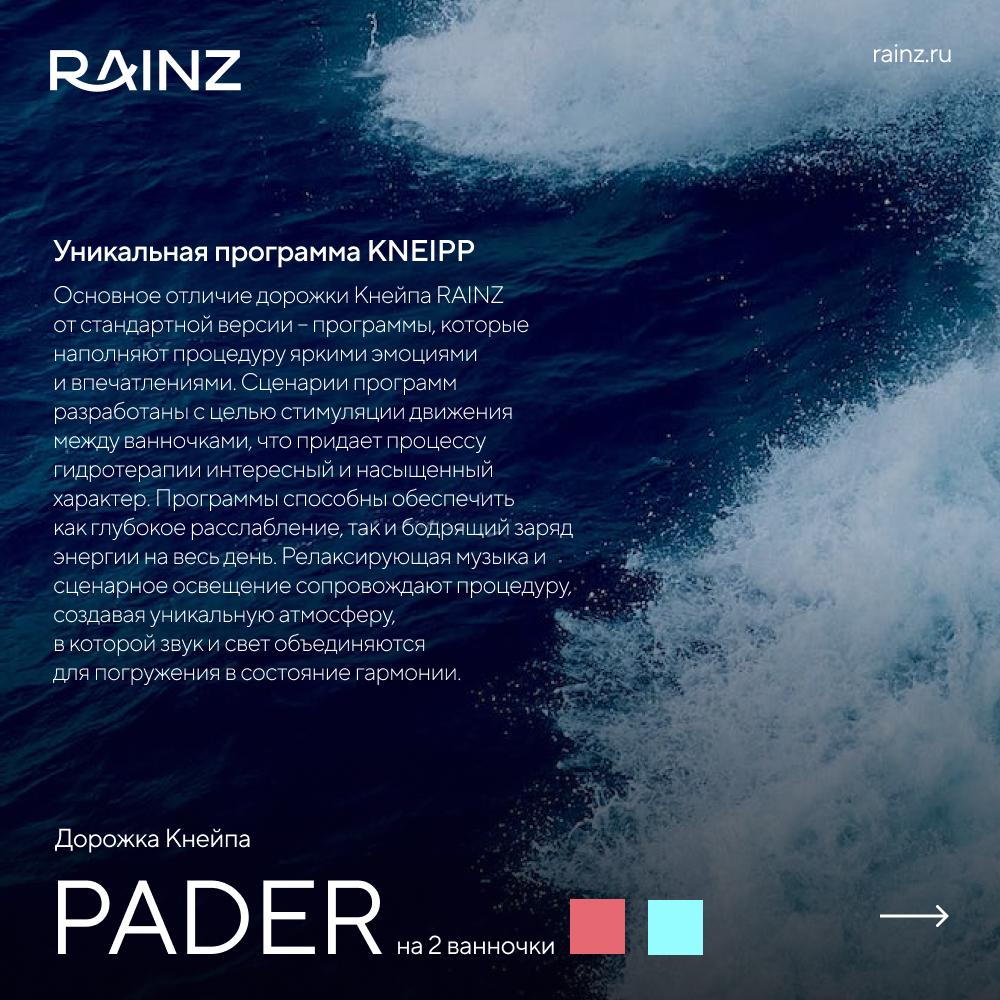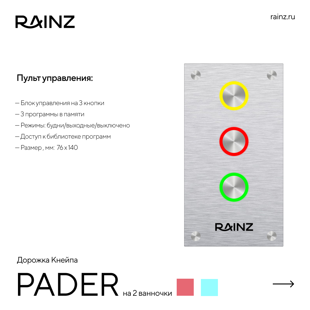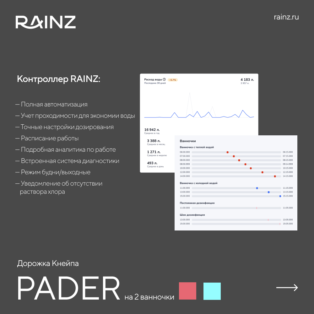 Совершенно новая версия дорожки Кнейпа от компании RAINZ. Полностью программируемый расход, рабочий день, обновление воды, объем дезинфекции и кратность водообмена. А еще и со сценарным освещением и фоновой музыкой.