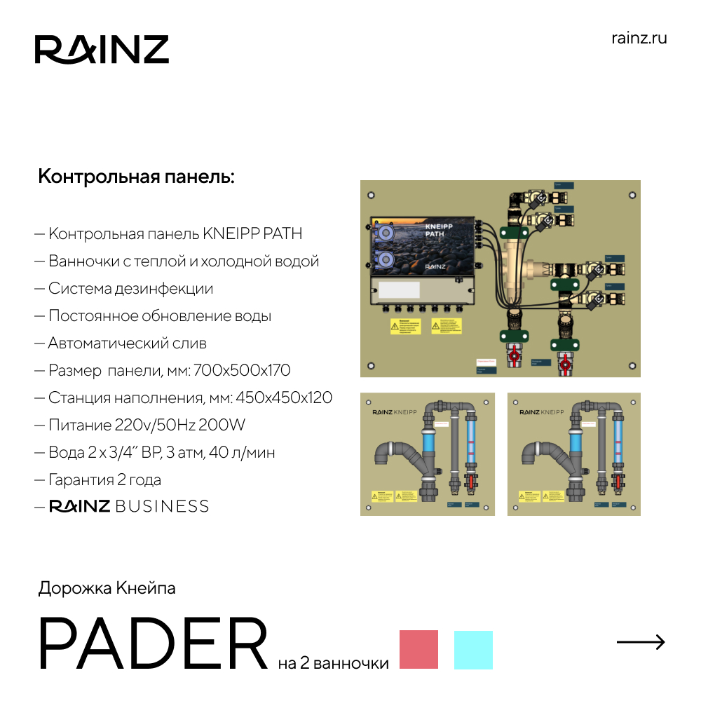 Комплект рассчитан на 2 ванночки с теплой и холодной водой, с подсветкой. Cпециально разработанные программы RAINZ для дорожки Кнейпа позволяют получить еще больший эффект за счет стимулирования переходов между ванночками. Спокойное, музыкальное релакс сопровождение позволит сосредоточиться на процедуре. Автоматическое наполнение и опустошение ванночек. Система контроля постоянного обновления воды с непрерывной дезинфекцией. Встроенная система дезинфекции. Полностью готовая к установке монтажная панель. Вход горячей и холодной воды 2x3/4’’ ВР с фильтрами грубой очистки и запорными кранами, 2 выхода на ванночки с теплой и холодной водой. Термостат с регулировкой температуры теплой воды от 20℃ до 43℃ с антиожоговой защитой, исключающей подачу горячей воды. Контроллер RAINZ для управления водой, подсветкой, музыкой и дезинфекцией. Два автоматических сливных клапана. Две станции автоматического наполнения, обновления, дезинфекции воды. Питание 220v/50Hz 200W, вода 2 х 3/4’’ ВР, 3 атм, размер: 700х500х170 (станции наполнения 450х450х120 - 2шт.), вода 2 х 3/4” ВР, 3 атм, 40 л/м (максимальный расход).