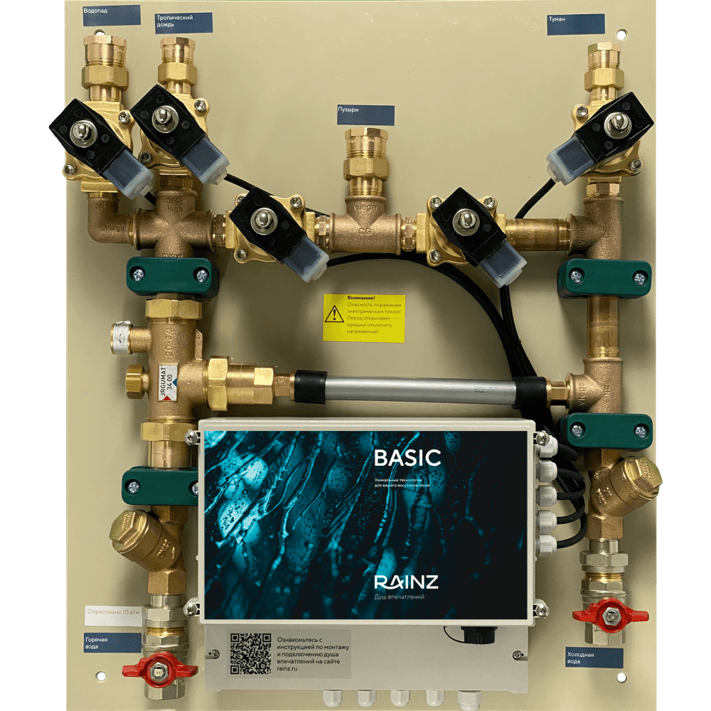 Единая монтажная панель в сборе, включающая: контроллер управления форсунками, музыкой, светом, термостат, комплект запорных кранов и фильтров, кнопка управления душем с светодиодной индикацией выбранной программы и интеллектуальным меню. Управление 4 независимыми форсунками. 7 программ в памяти и возможность устанавливать новые программы. Гарантия на оборудование 2 года (1 год для коммерческого использования).