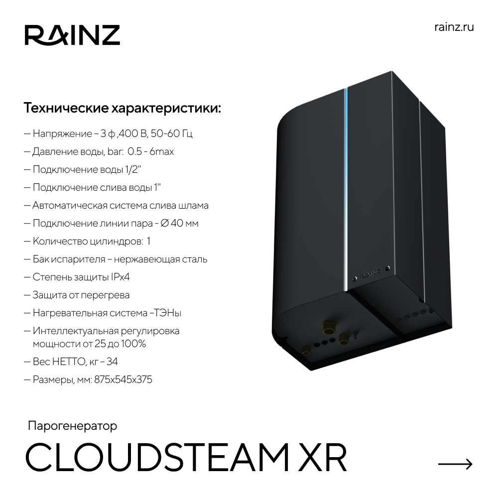 Встречайте многофункциональный парогенератор, который меняет представление о хаммаме. Это не просто устройство, а интеллектуальный центр вашей персональной вселенной комфорта, созданный для удовольствия и абсолютного благополучия. Забудьте о сложностях, компромиссах и ручных настройках. RAINZ CloudSteam создан для того, чтобы вы просто наслаждались каждой минутой.