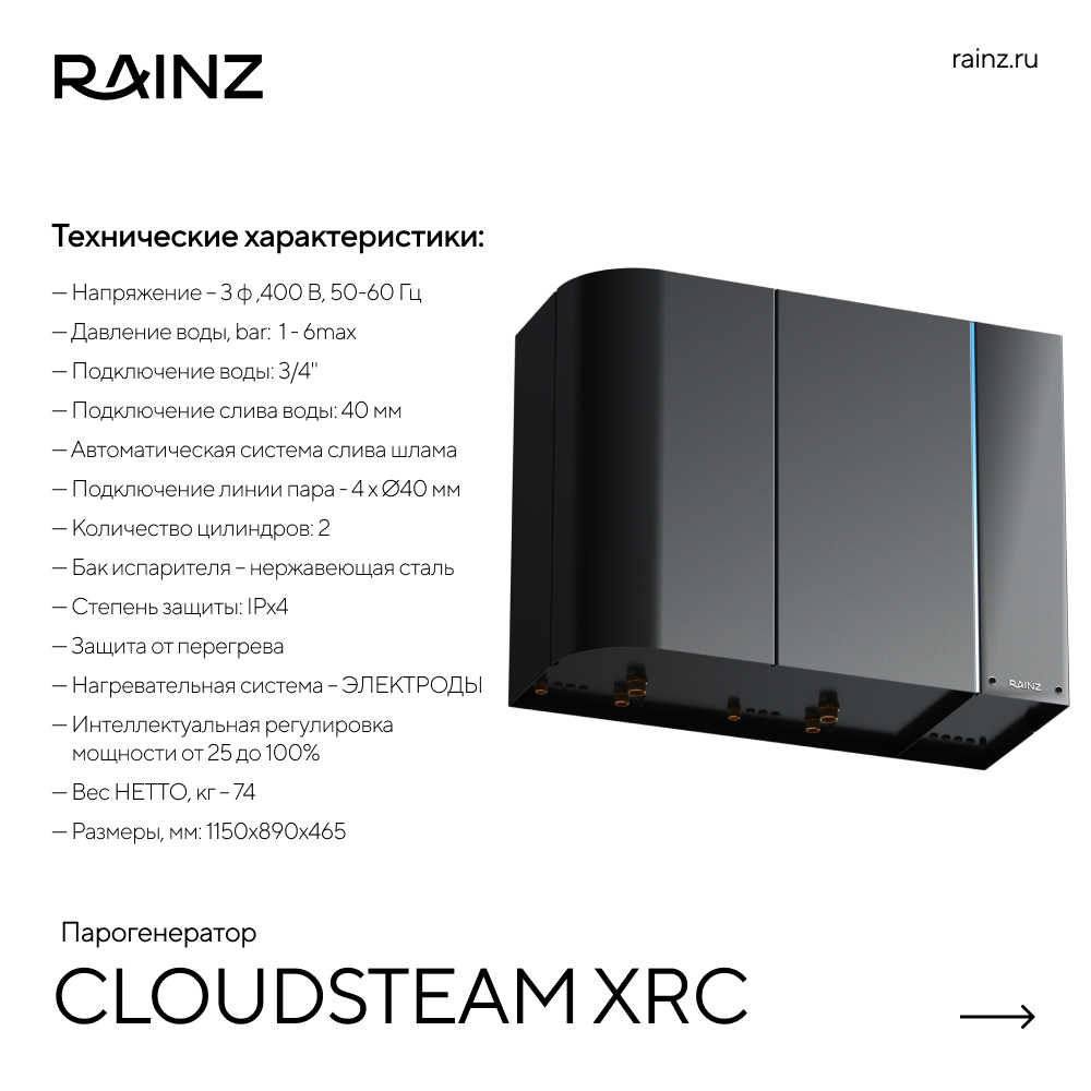 Представляем RAINZ CloudSteam XRC – не просто парогенератор, а интеллектуальную систему управления микроклиматом, разработанную специально для коммерческих хаммамов с высокой посещаемостью. Забудьте о хлопотах и сложностях – CloudSteam XRC создан для того, чтобы ваш бизнес процветал, а ваши клиенты наслаждались непревзойденным уровнем комфорта.