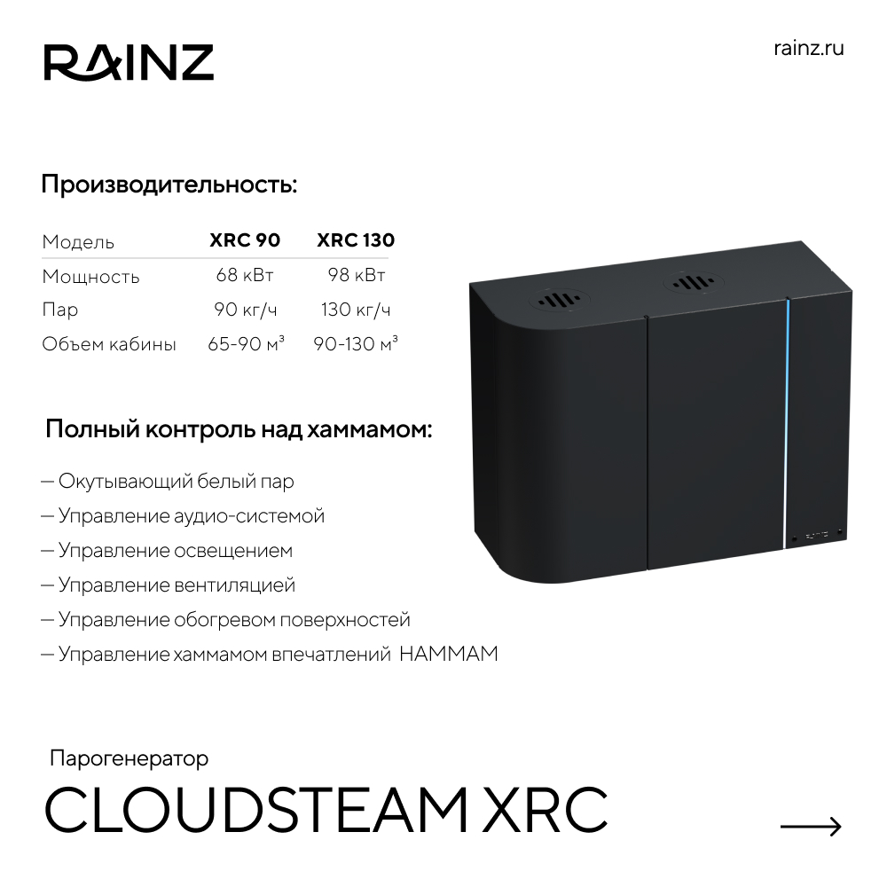 - Экосистема RAINZ: Полная интеграция для максимальной эффективности. Интегрируйте CloudSteam XRC с другими решениями RAINZ для создания единой и гармоничной системы управления вашим хаммамом.