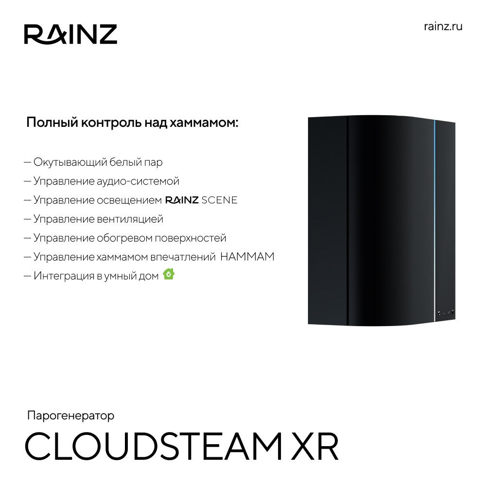 Встречайте многофункциональный парогенератор, который меняет представление о хаммаме. Это не просто устройство, а интеллектуальный центр вашей персональной вселенной комфорта, созданный для удовольствия и абсолютного благополучия. Забудьте о сложностях, компромиссах и ручных настройках. RAINZ CloudSteam создан для того, чтобы вы просто наслаждались каждой минутой.